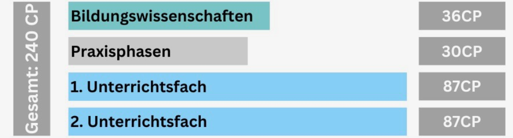 - Studienbereiche: Bildungswissenschaften (36 CP) / 1. Unterrichtsfach (87 CP) / 2. Unterrichtsfach (87 CP) / Praxisphasen (30 CP)